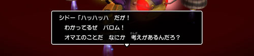 シドー失踪前のギスギスなど最初から無かったかのように、主人公たちに笑顔が戻ったことを指摘して、シドーの謎エネルギーをイジる。