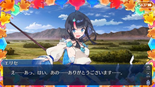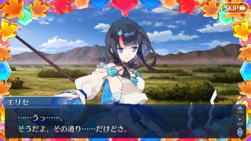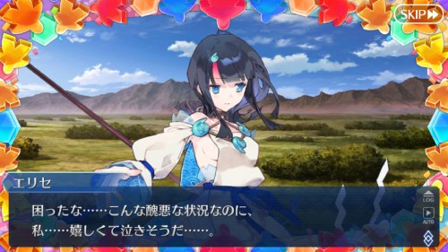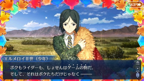 イスカンダルを始めとする大英雄に敬意を払ったり、彼らと共に戦える境遇に感極まっていたり、対カルデア時のピリピリエリちとはまた違う年相応さを覗かせる。かわいいね。