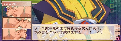 最初は笑って開き直っていたランスも、リアル切腹を目の前でやらかされると、「ちゃんとやる…やるよ、ちくしょう…」と観念した。
